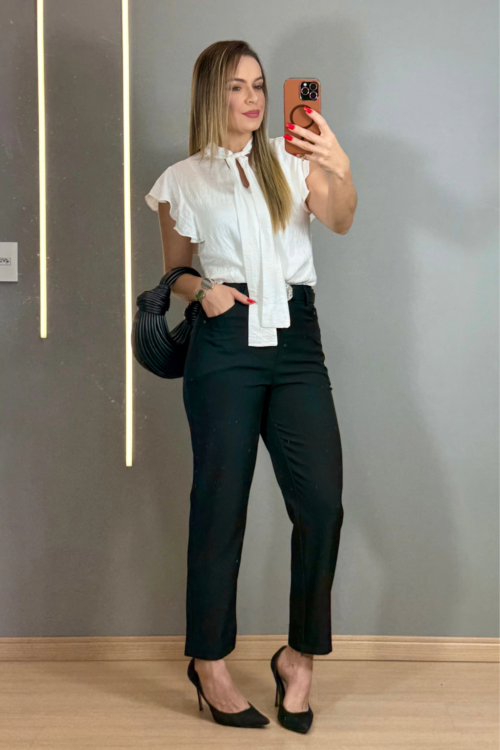 O destaque fica por conta das mangas com babados, que adicionam movimento e feminilidade, enquanto a amarração frontal oferece um detalhe especial que valoriza a silhueta. A blusa é lisa, sem estampas, facilitando combinações versáteis para o seu guarda-roupa.