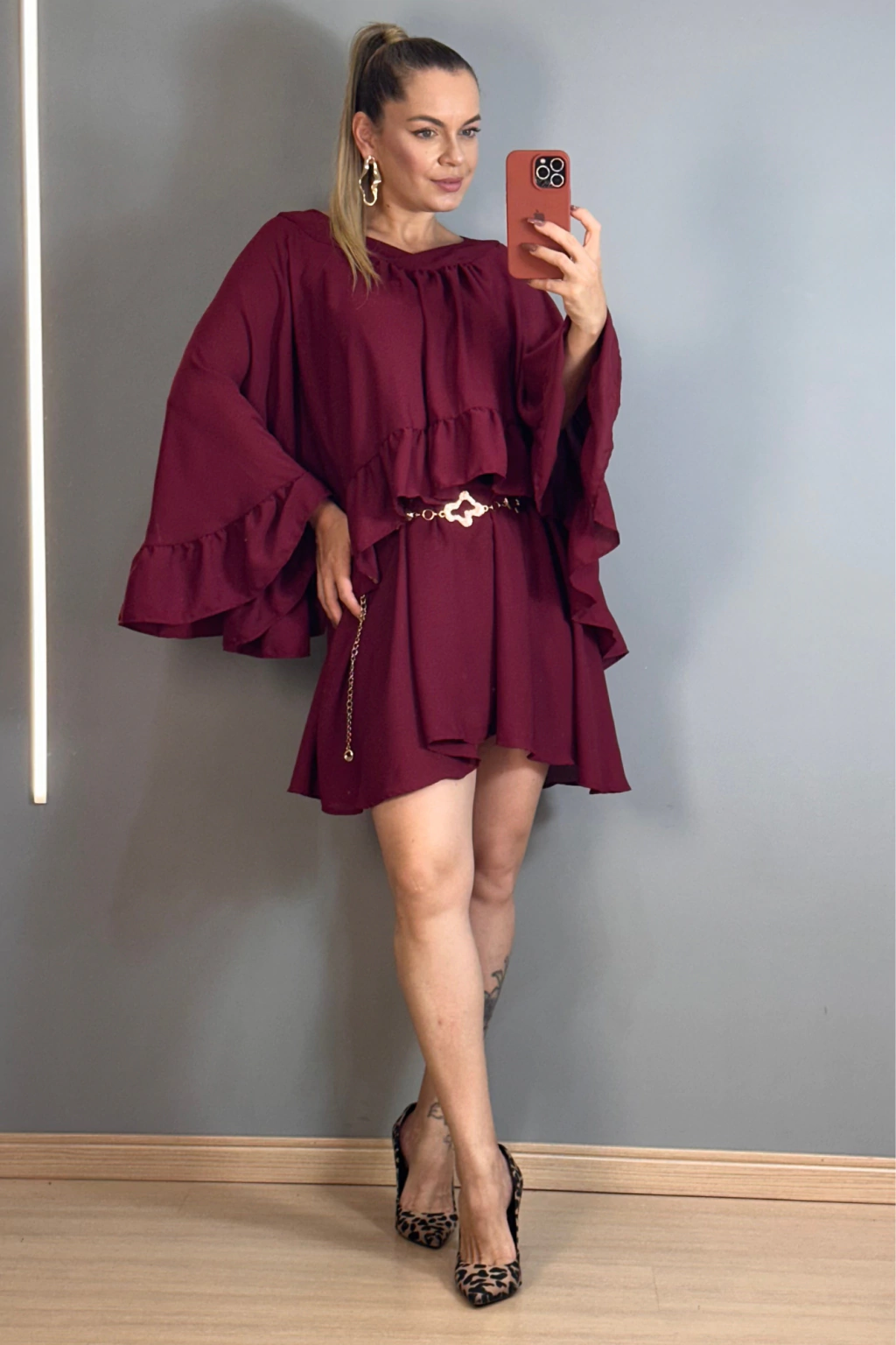 Descubra o charme e a sofisticação do Conjunto Vestido e Bata Sobreposta Bordô, perfeito para quem busca elegância com conforto. O vestido curto, com alcinhas reguláveis e elástico na parte posterior do busto, garante um caimento impecável e adaptável ao corpo.