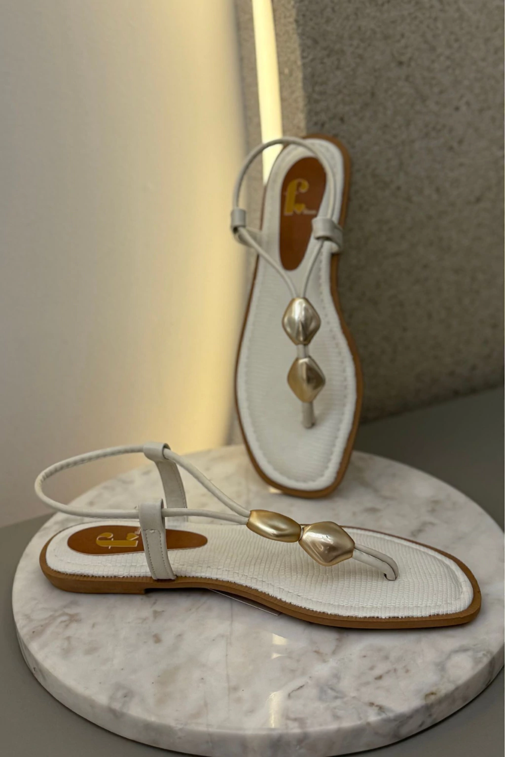 Sandália rasteira em tom off-white, com tiras finas e design minimalista. Possui detalhe frontal composto por duas peças metálicas douradas em formato orgânico, que adicionam elegância ao modelo. O solado apresenta textura delicada e bordas em acabamento caramelo, garantindo conforto e sofisticação. Perfeita para compor looks leves e chic.